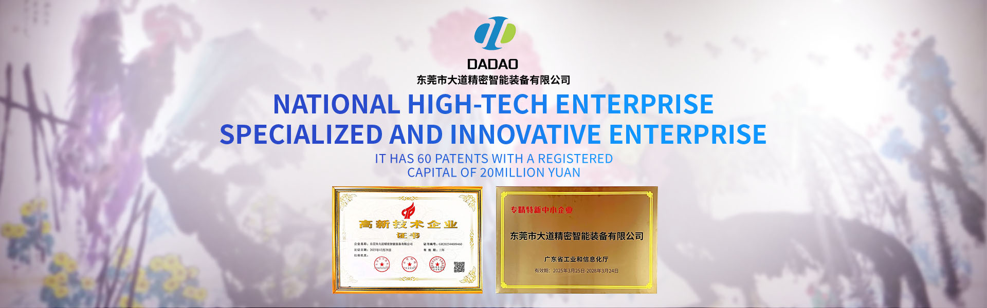 Founded in 2019, Dongguan DaDao Precision Intelligent Equipment Co., Ltd. has a registered capital of 10 million yuan and occupies over 20,000 square meters of office and factory space. The company is certified under the ISO 9001:2015 international quality management system, holds over 60 national patents, and has been honored with titles such as "China DaDao Trademark" and "Belt and Road 10th Anniversary National Gift Brand." As a national high-tech enterprise and a specialized, refined, and innovative small and medium-sized enterprise, DaDao Precision is dedicated to transforming manufacturing towards low-carbon, energy-efficient, and high-efficiency solutions, promoting green and intelligent automation in manufacturing processes. In April 2023, the company established the "Dongguan DaDao Precision Intelligent Equipment Co., Ltd. Care for the Next Generation Working Committee." It serves as the Vice President Unit of the Qishi Town Federation of Industry and Commerce, Vice President Unit of the Qishi Town Literary and Art Federation, Vice President Unit of the Dongguan Environmental Packaging Industry Association, President Unit of the Second Council of the Dongguan CNC Equipment Industry Association, Standing Director Unit of the Guangdong Packaging Technology Association, Director Unit of the Guangdong Adhesive Industry Association, and a drafting unit for the national standard Basic Requirements for Safety Protection Authorization Systems in Machinery Safety.